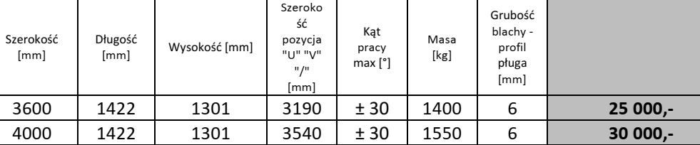Wysokość (mm) | Masa (kg) | Grubość blachy-profil pługa (mm) | Minimalna moc ciągnika (KM) |